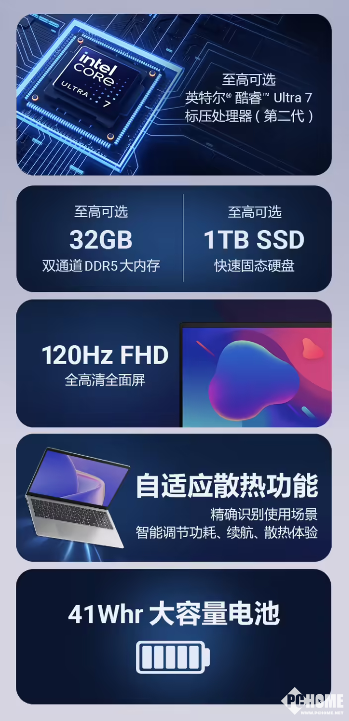 该机处理器搭载英特尔酷睿Ultra 200H系列(Ultra 5-225H / Ultra 7-255H),属于第三代酷睿Ultra移动处理器,强化了AI算力与能效表现。全系存储标配16GB内存,硬盘可选512GB或1TB SSD,满足主流办公与轻度创作需求。屏幕配备120Hz高刷新率显示屏,提升了视觉流畅度。