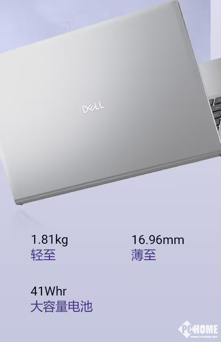 该机采用银色配色,整体重量1.81千克,厚度16.96毫米,拿取较为便捷。A面带有戴尔Logo,B面配备一块1920x1080分辨率120Hz面板(亮度至高250尼特)。机身左侧配备1个HDMI1.4、1个USB-A3.2、1个USB-C接口;右侧配备1 个USB-A 2.0接口、1个3.5mm音频接口。兼顾了性能与移动携带便利性。