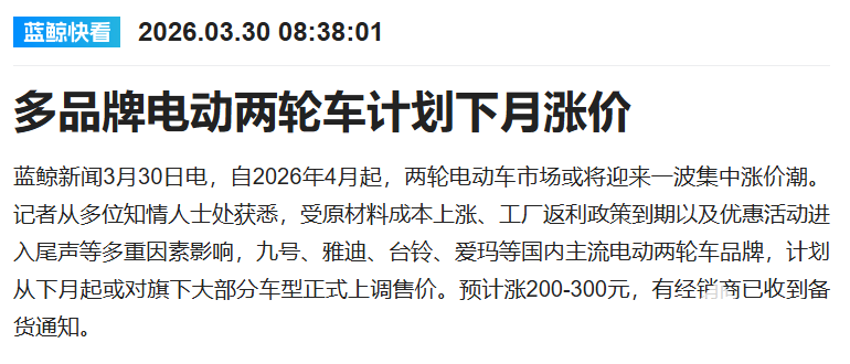 PChome 3月30日消息,据《蓝鲸新闻》报道,受原材料成本上涨、工厂返利政策到期及优惠活动收尾等因素影响,九号、雅迪、台铃、爱玛等国内主流电动两轮车品牌,计划自2026年4月起上调旗下大部分车型售价,预计涨幅200-300元。