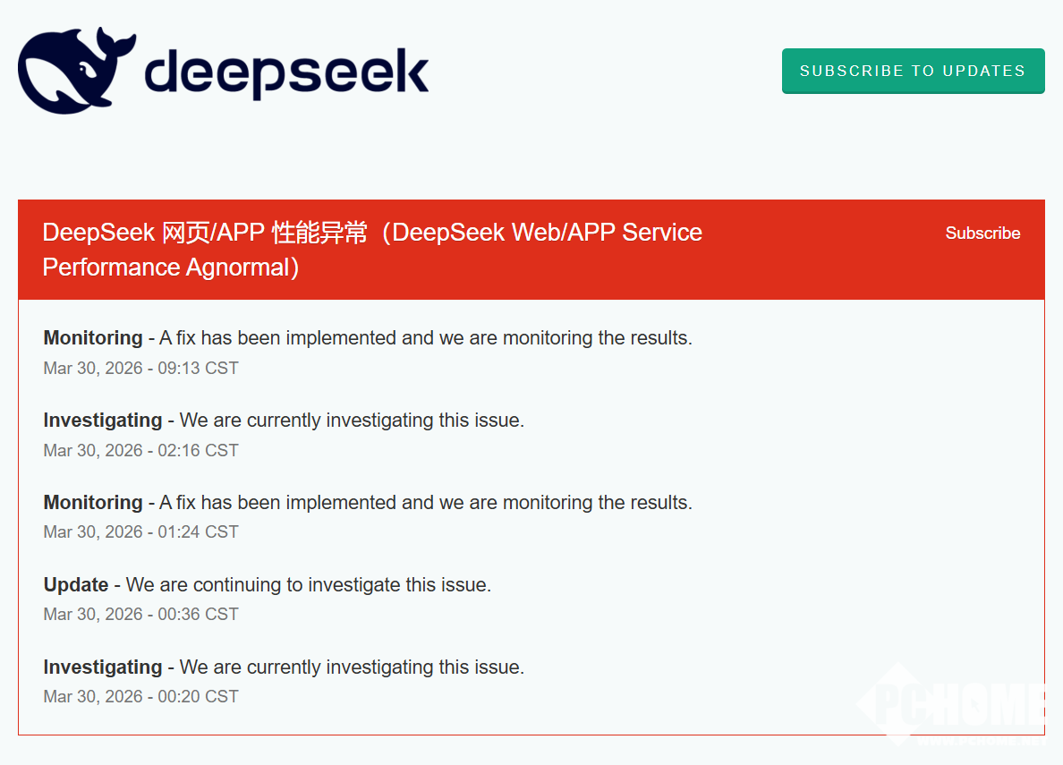 PChome 3月30日消息,国内主流大模型DeepSeek自3月29日21:35起突发大规模服务中断,网页端与App持续报错“性能异常”,截至30日上午9点13分,故障超12小时后,官方已进行修复,目前正在监控运行效果。