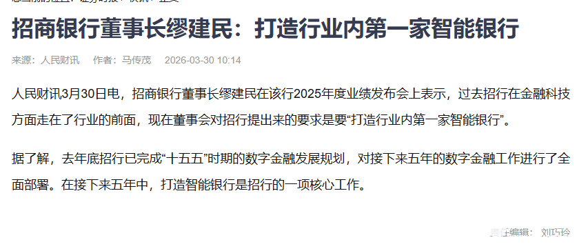 PChome 3月30日消息,据《证券时报》今日报道,招商银行董事长缪建民在2025年度业绩发布会中明确表示,依托行业领先的金融科技基础,招行正计划“打造行业内第一家智能银行”。