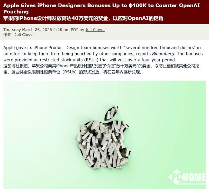 PChome 3月30日消息,根据彭博社记者马克·古尔曼证实,苹果正通过发放高额限制性股票奖金,试图阻止iPhone产品设计工程师跳槽至OpenAI等 AI 公司。