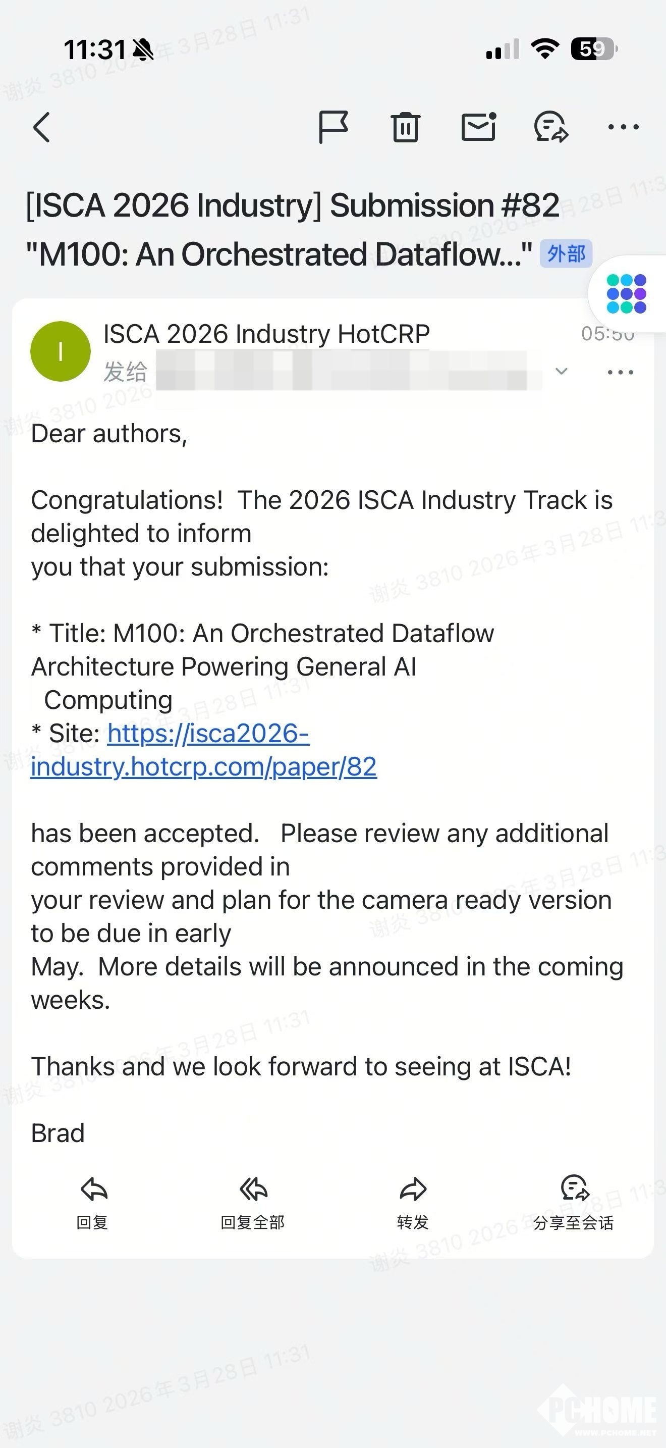 PChome 3月30消息,理想汽车CEO李想通过社交平台宣布,其自研的马赫100芯片相关技术论文,已被计算机体系结构领域全球最顶级的学术会议ISCA(国际计算机体系结构研讨会)的2026年Industry Track(产业界轨道)录用。这标志着理想汽车在AI芯片底层架构上的创新,获得了全球最权威学术评审的认可。