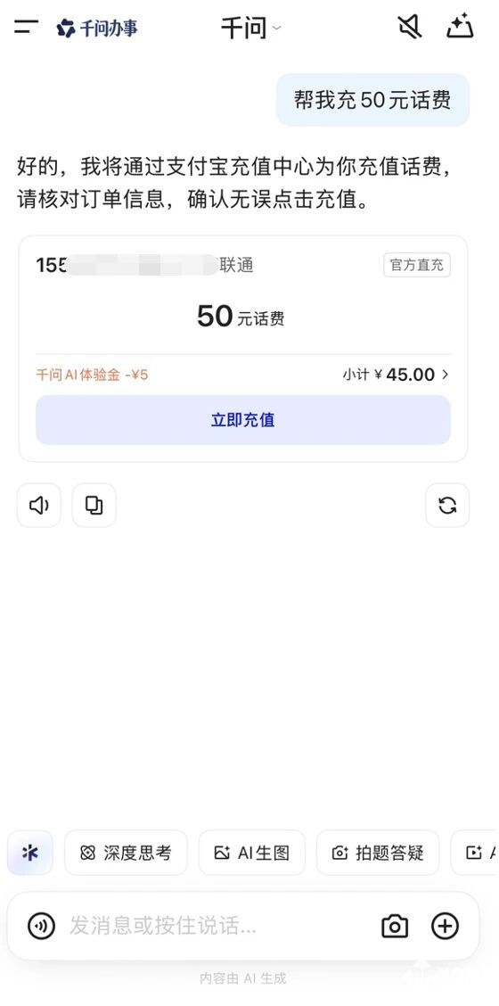 据悉,用户只需打开千问APP,像平常对话一样说出需求,例如“帮我手机充50元”。千问在理解指令后,会通过支付宝充值中心生成订单,并引导用户核对信息。确认无误后点击支付,即可调用已授权的支付宝账号完成交易,整个过程流畅无感。对于首次使用的用户,仅需在千问内完成一次支付宝账号的授权绑定,后续支付时通过面容、指纹或密码等本人核身方式验证即可,兼顾了便捷与安全。
