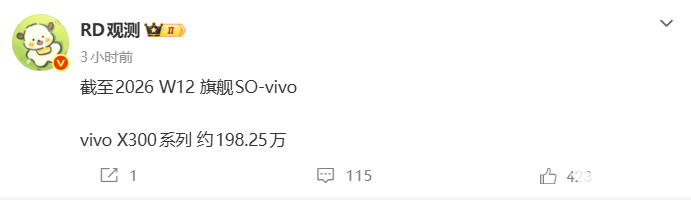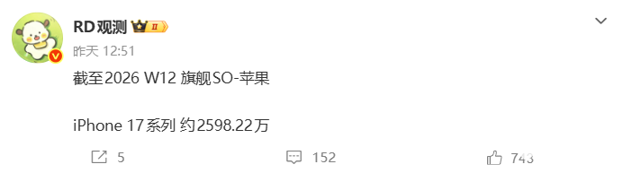 PChome 3月30日消息,据博主“RD观测”最新数据,截至2026年第12周,小米17系列国内累计出货量约426.09万台;同期iPhone 17系列出货达2598.22万台,约为小米的6倍,高端市场呈现苹果断层式领先。