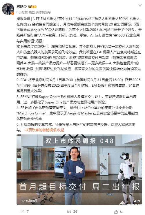 此外,他还宣布,FFAI将于北京时间4月1日早7:30召开2025全年业绩电话会,并公布2025四季度及全年财报与EAI战略进展。