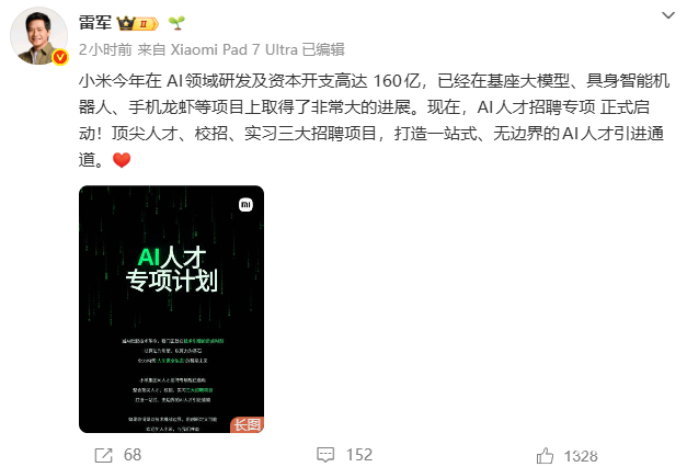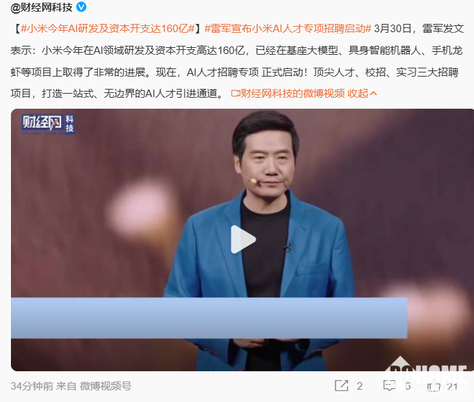 PChome 3月30日消息,今日,小米创始人雷军正式启动AI人才专项招聘计划,宣布2026年在AI领域投入160亿元,并开放顶尖人才、校招、实习三大通道,加速布局大模型、机器人及手机AI技术。