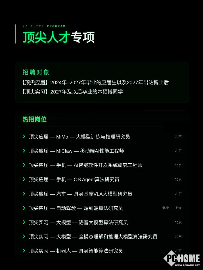 雷军此次开展三大招聘通道整合:顶尖人才计划——面向2024–2027年应届毕业生及博士后,聚焦大模型训练、AI性能优化等核心岗位(如大模型训练研究员、具身智能算法研究员);全球校招——针对2026届海内外应届生,覆盖AI算法、汽车架构、多模态算法等岗位,工作地含北京、上海、南京等;实习生计划——开放大模型语音、AI安全、Agent开发等方向,面向全体在校大学生。