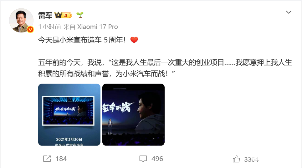 PChome 3月30日消息,小米创办人,董事长兼CEO雷军发文纪念小米造车5周年,回顾他在五年前的今天官宣造车时的承诺:“这是我人生最后一次重大创业项目,我愿意押上全部战绩与声誉,为小米汽车而战”。