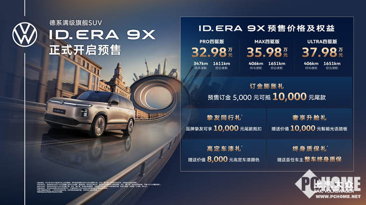 PChome 3月30日消息,上汽大众旗舰SUV“ID. ERA 9X预售发布会”在深圳举行,上汽大众汽车有限公司大众品牌营销事业执行总监李俊宣布ID. ERA 9X开启预售,本次共推出Pro、Max、Ultra三款四驱版车型,全系标配副驾零重力座椅、二排副驾侧动态零重力座椅、主动后轮转向系统、行云智能辅助驾驶终身使用权等,预售价分别为32.98万元、35.98万元和37.98万元。