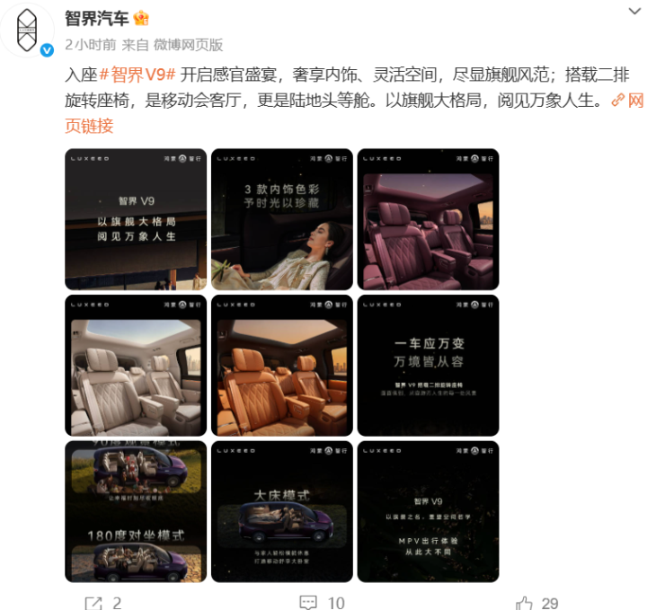 作为鸿蒙智行首款MPV,智界V9以灵活座椅的设计将为用户带来更丰富的驾乘体验。新车预计于4月正式上市,4月下旬展车将陆续到达线下门店。