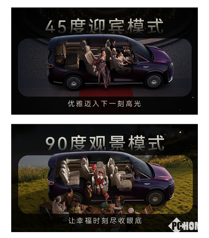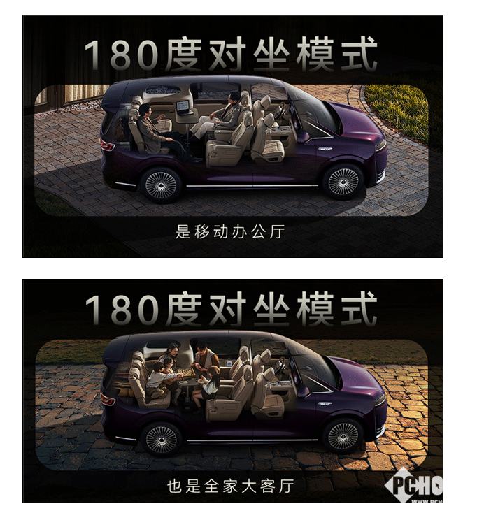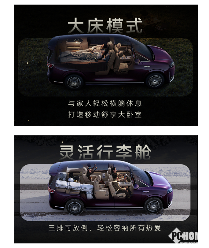 第三排座椅可电动调节并完全放倒,与旋转后的二排组合形成“大床模式”,适用于长途休憩与大件装载。新车还搭载行业首发头套式安全气囊,为零重力躺姿提供立体防护。新车内饰提供绒霞紫、赤茶橘、韶华杏三种配色,采用NAPPA真皮,搭配天然实木与水晶饰件,兼顾豪华与实用。