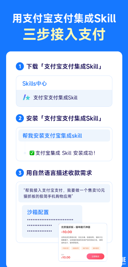 PChome 3月31日消息,支付宝于2026年3月31日正式上线国内首个支付集成Skill,通过三步标准化操作即可为APP快速接入支付能力,将传统复杂的开发流程简化为自然语言交互式的AI驱动模式。