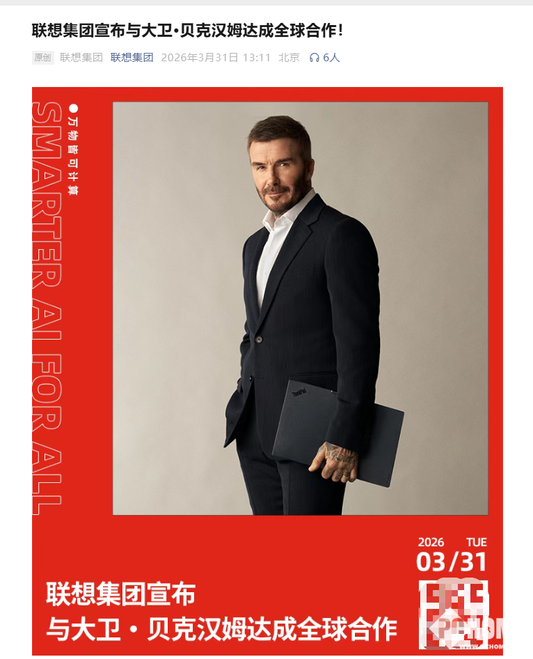 PChome 3月31日消息,联想集团今日宣布与足球运动员大卫·贝克汉姆达成全球合作,双方将携手探索“AI+体育”创新方案,助力足球产业数字化升级。
