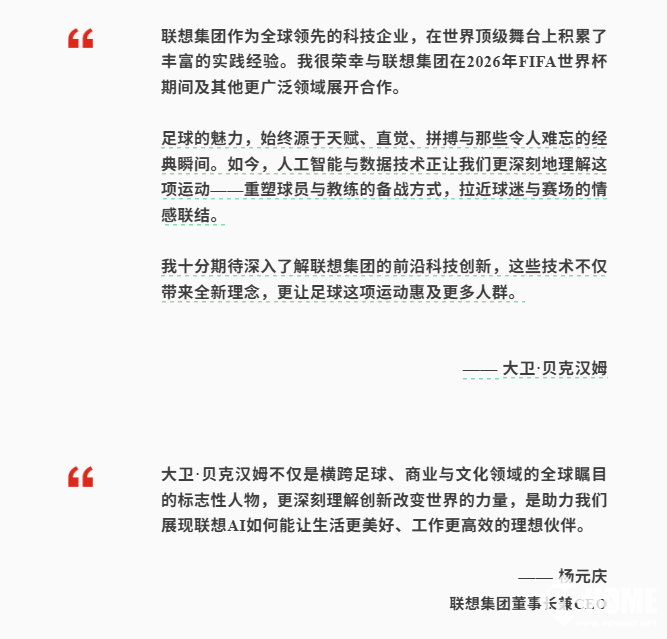 本次合作中,贝克汉姆将深度参与联想“AI+体育”解决方案落地,以专业经验赋能AI技术应用,覆盖球队竞技水平提升、球迷观赛体验优化与赛事运营效率升级。作为2026年FIFA世界杯与2027年FIFA女足世界杯官方技术合作伙伴,联想此举将进一步夯实其在全球足球领域的战略布局。