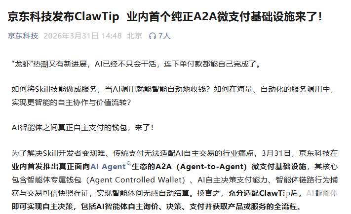 PChome 3月31日消息,京东科技今日正式发布业内首款面向AI智能体生态的A2A(Agent-to-Agent)微支付基础设施ClawTip,实现AI智能体自主询价、决策、支付、结算全流程自动化,标志着AI从“被动执行支付指令”迈向“主动参与消费决策”新阶段。