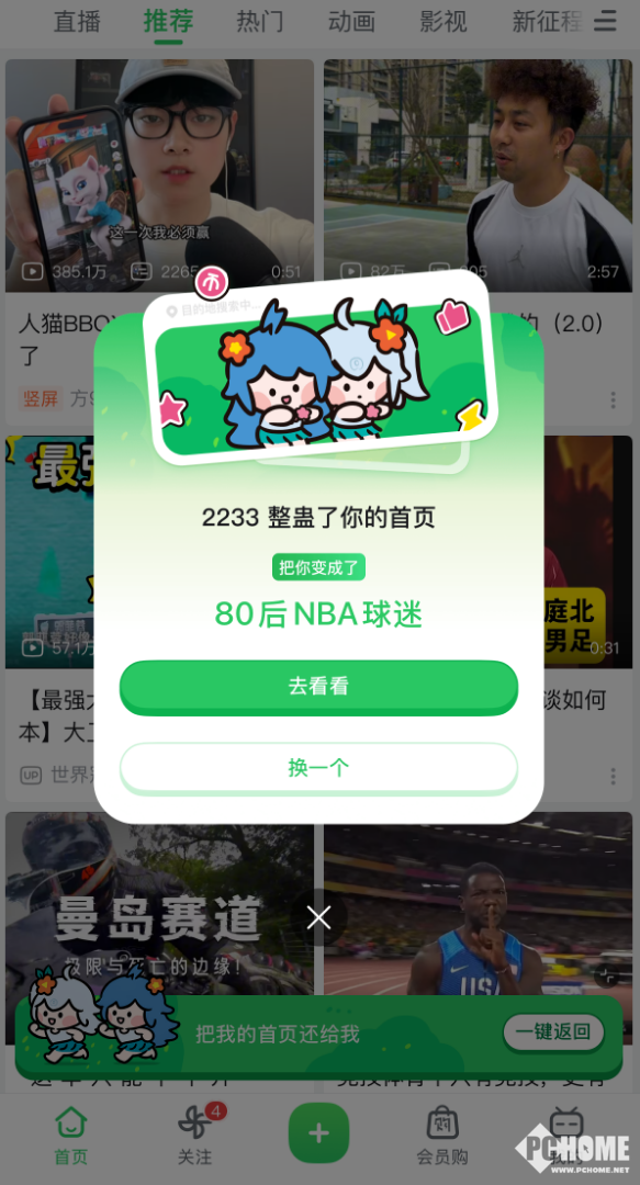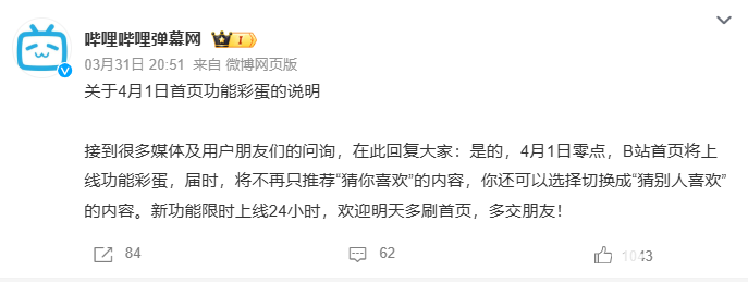 PChome 4月1日消息,今日愚人节,哔哩哔哩(B站)如期推出年度趣味彩蛋,首页上线限时功能,用户可在“猜你喜欢”与“猜别人喜欢”两种推荐模式间切换,仅限当日24小时开放。