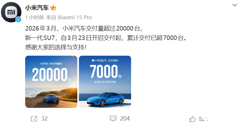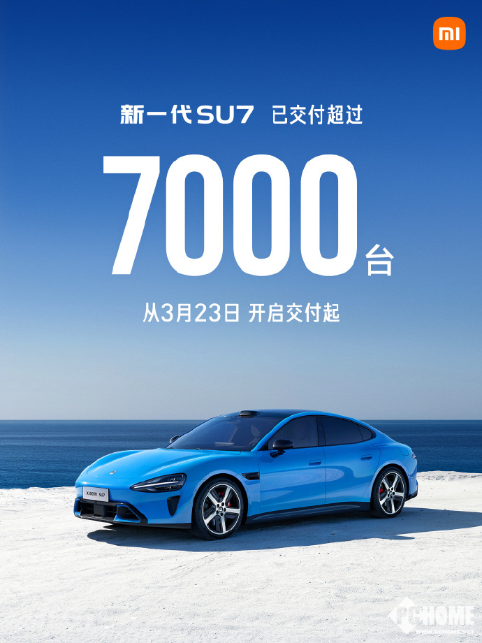 PChome 4月1日消息,小米汽车官方宣布,3月全系车型交付量突破20000台。其中,3月23日启动交付的新一代SU7截至月末9天累计交付超7000台,展现出强劲的市场爆发力。