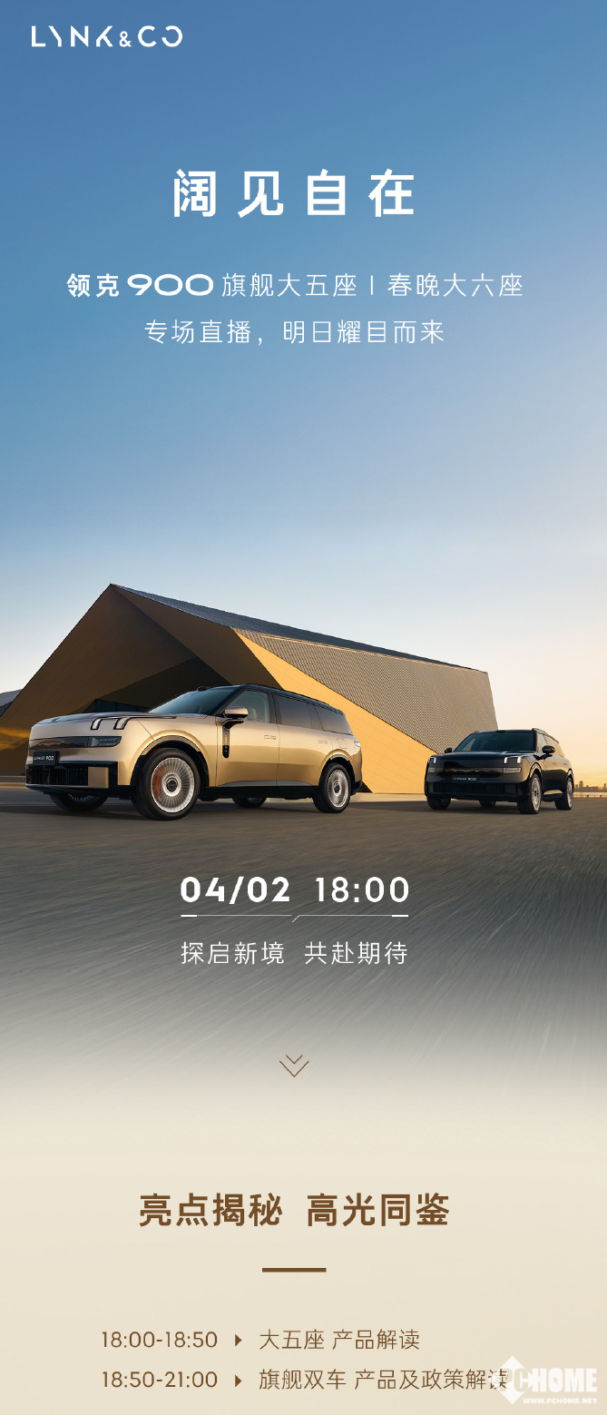 PChome 4月1日消息,领克汽车官方宣布将于4月2日18:00正式亮相两款全新旗舰车型——领克900旗舰大五座和春晚大六座,其中大五座主打极致空间与实用功能,春晚大六座则延续春晚“奇妙座驾”的高端基因。