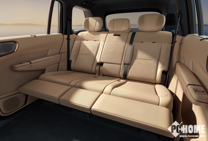 领克900旗舰大五座车身尺寸达5240mm×3160mm(轴距),拥有同级最大后备箱、同级独有二排儿童床、同级最宽绰二排以及真三座嘉宾席,并设计为纯平地板与1350mm超宽座椅,支持加热功能,中间座位与两侧同享舒适平权。后备箱标准容积1030L,二排前移后可扩展至1215L,纵深1350mm可容纳山地自行车等大件物品。座舱得房率88.2%,越级空间设计为同级最大混动五座SUV。