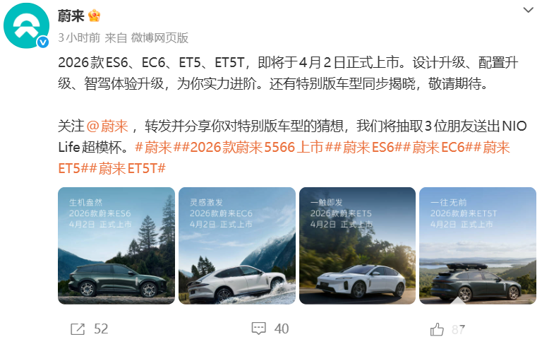 PChome 4月1日消息,蔚来汽车官方宣布,2026款ES6、EC6、ET5、ET5T(“5566”车系)将于4月2日正式上市。四款车型同步迎来设计、配置、智驾三大维度升级,并推出特别车型,产品力全面进阶。