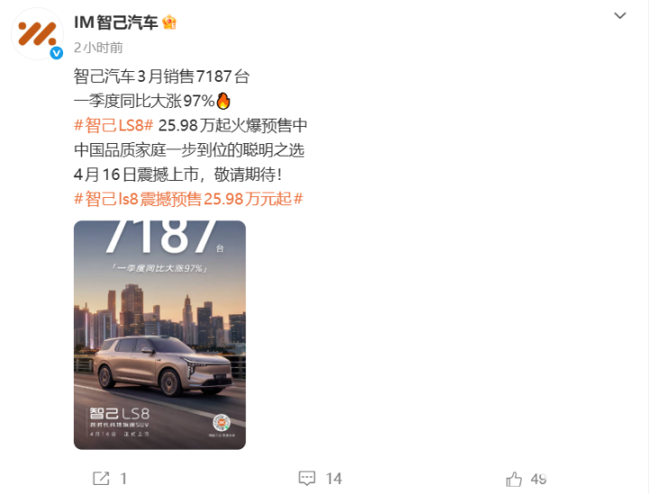 PChome 4月1日消息,智己汽车官方今日公布最新销量数据:3月单月销量达7187辆,2026年第一季度累计销量同比大涨97%,展现出强劲的增长势头。