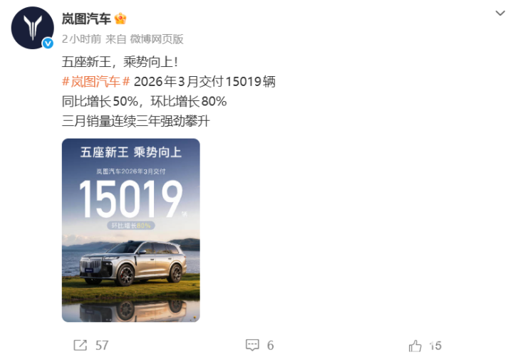 PChome 4月1日消息,岚图汽车今日公布2026年3月交付数据:单月交付15019辆,同比增长50%、环比增80%,一季度累计交付33892辆,同比增长30%。