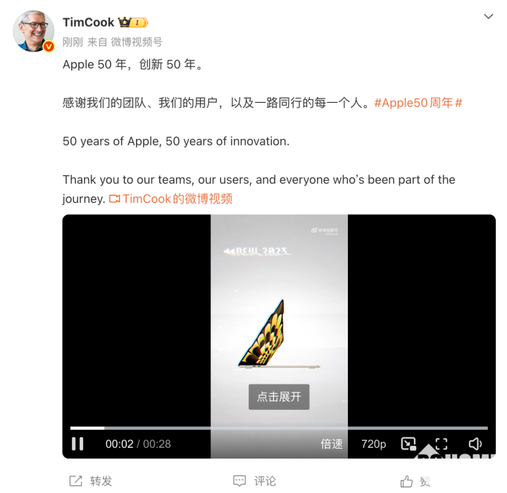 值得注意的是,蒂姆·库克发布的视频回顾了苹果创办50年以来的50款标志性产品,包括MacBook Air、Apple Watch Ultra、Apple Vision Pro等。