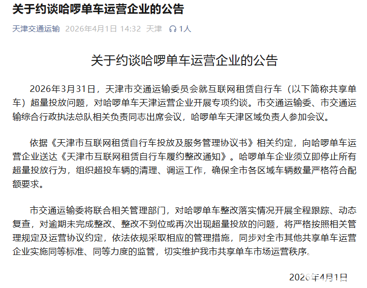 PChome 4月1日消息,天津交通运输官方今日发布公告,因哈啰单车天津运营企业存在互联网租赁自行车超量投放问题,天津市交通运输委员会于3月31日对其开展专项约谈。