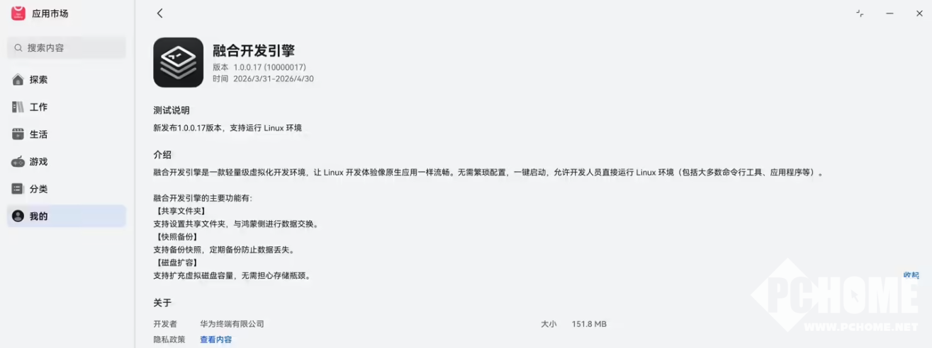 PChome 4月1日消息,华为终端自研的“融合开发引擎” 已正式上线鸿蒙PC端应用市场“尝鲜专区”,推出1.0.0.17版本,支持直接运行Linux环境,为开发者提供轻量、一体化的跨平台开发能力。