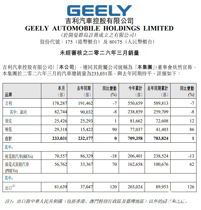 PChome 4月1日消息,吉利汽车刚刚公布了最新的2026年3月产销数据,3月汽车总销量为233031辆,与去年同期持平。