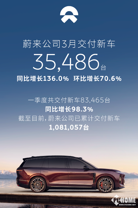 PChome 4月1日消息,蔚来汽车公布2026年3月交付数据,单月交付新车3.55万台,同比增长高达136.0%,环比也大幅增长70.6%。