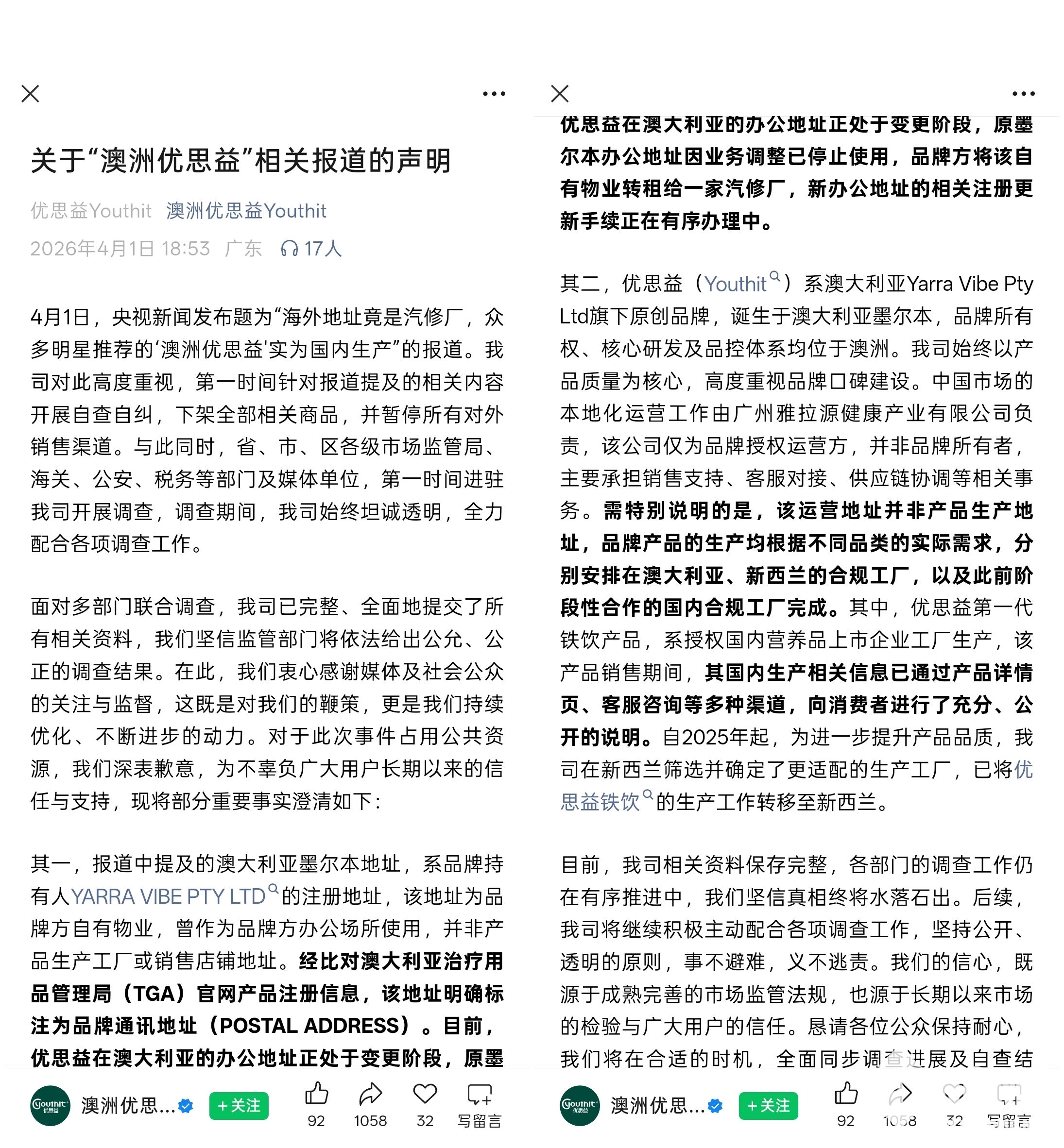 优思益方面已于4月1日发布声明,解释称,澳洲地址为注册通讯地址,因业务调整转租汽修厂,部分产品曾在国内合规生产,2025年已将生产工作转至新西兰工厂。并表示,目前已下架全部商品、暂停全渠道销售,积极配合多部门联合调查。
