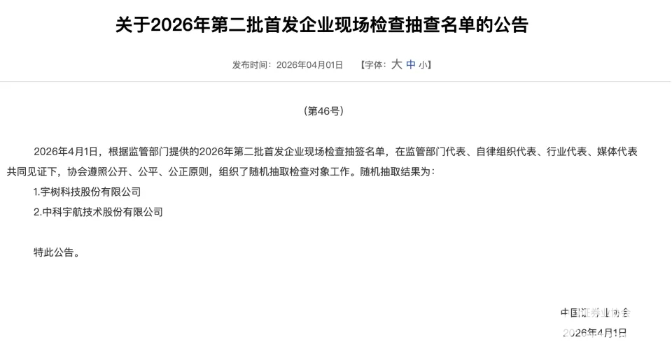 PChome 4月1日消息,宇树科技科创板IPO申请于2026年3月20日获上交所受理,仅12天后,中国证券业协会随机抽取的现场检查名单中,宇树与同期申报的中科宇航同时入选。