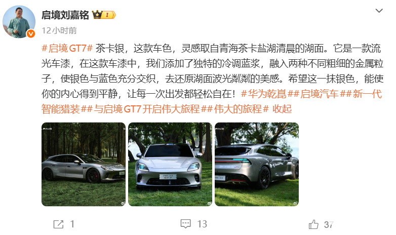 PChome 4月2日消息,昨日晚间,华为乾崑|启境汽车CEO刘嘉铭正式发布启境GT7智能猎装车“茶卡银”配色实车官图,新车计划于6月举办上市发布会,届时公布售价、配置及交付细则,预计上市即交付。