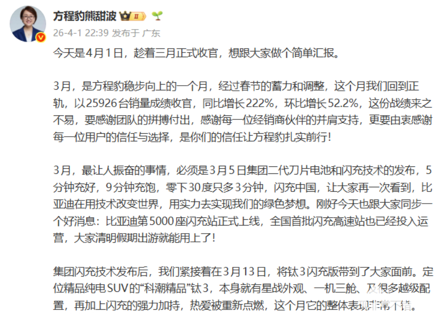 PChome 4月2日消息,方程豹汽车总经理熊甜波于昨日通过官方微博正式宣布,品牌首款轿车系列研发进展顺利,并将在即将开幕的北京车展迎来首次亮相。