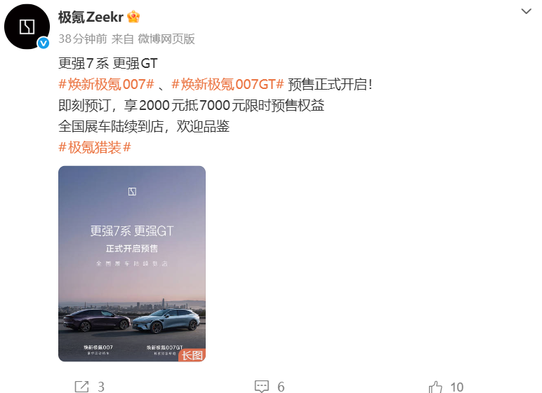 PChome 4月2日消息,极氪汽车今日宣布焕新极氪007/007GT正式开启预售,两款车型(合称焕新极氪“7系”)全系升级900V高压架构,并提供FR-LINE性能套装可选,预售权益为2000元抵7000元,将于4月10日正式上市。