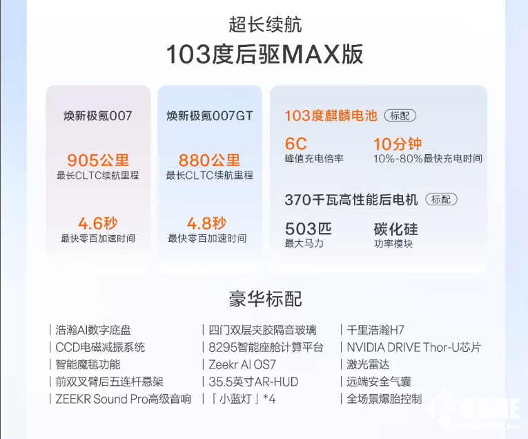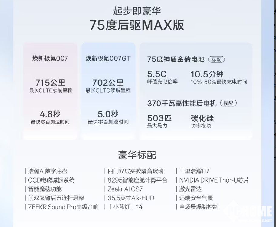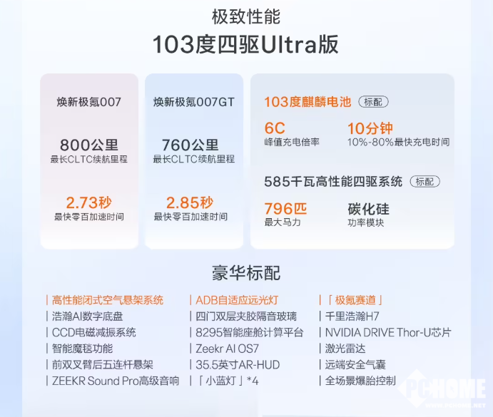 据介绍,新车搭载NVIDIA DRIVE Thor-U智驾芯片,算力达700TOPS,全系标配激光雷达与4颗智驾小蓝灯,智驾能力大幅提升。动力提供单/双电机版本,后驱最大功率370kW,四驱总功率585kW,零百加速最快2.73秒。续航方面,配备75/103kWh电池,极氪007 CLTC续航最高905km,007GT达880km,10%-80%快充仅需10分钟。底盘标配浩瀚AI数字底盘、闭式空气悬架与CCD电磁减振,搭载智能魔毯功能。