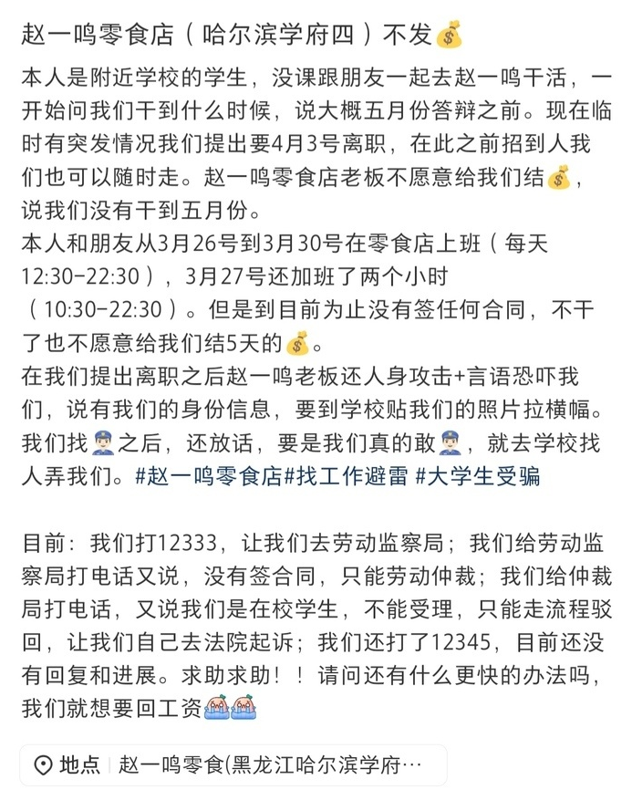 PChome 4月2日消息,据新黄河报道,近日,黑龙江哈尔滨两名大学生在赵一鸣零食店兼职5天后因突发情况离职,索要薪资遭拒,店方以“全职员工工资次月发放”为由拒付即时结算,引发争议。