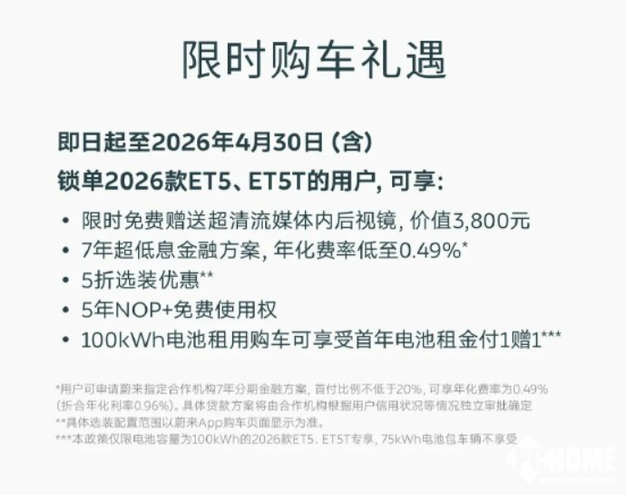 即日起至4月30日,锁单用户还可享专属权益,包括赠3800元流媒体后视镜、8500元主驾零重力座椅、5年NOP+免费使用权、7年低息方案;100kWh租电首年付1赠1;特别版加赠价值466元的专属提车礼;复购用户还可享受专属积分。