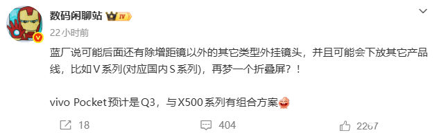 PChome 4月2日消息,博主@数码闲聊站昨日爆料,vivo可能后面还有除增距镜以外的其它类型外挂镜头,并且可能会下放其它产品线,比如V系列 (对应国内S系列)。此外,他还透露,vivo Pocket 预计Q3发布,与X500系列有组合方案。