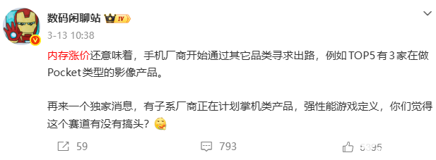 此前,该博主3月还曾透露,随着内存持续涨价,手机厂商们正通过其他品类谋求出路,例如TOP5厂家中有3家在做Pocket类影像产品。援引博文新闻消息,OPPO方确认启动立项手持智能影像设备,对标 GoPro、大疆等主流手持智能影像设备厂商;而vivo也在积极布局相关市场,前年年底立项,其首款产品已完成开模,按照节奏预计今年能发布;荣耀这边则是已经端出了Robot Phone手机机器人,具身智能与高清摄像及AI的超强大脑和机器人的行动力,同时可化身用户专属摄影机,具备ARRI阿莱合作影像。