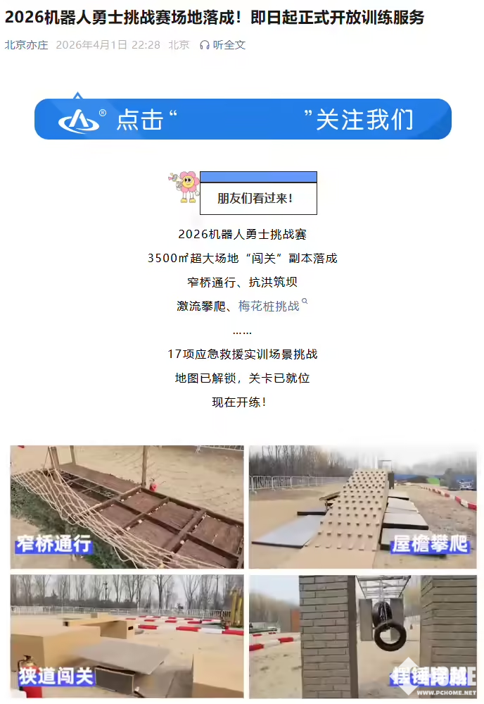 PChome 4月2日消息,昨晚,北京亦庄”公众号发文,2026机器人勇士挑战赛完成全部场地搭建工作,赛事场地于南海子公园熏风园(原二期)正式落成,并按计划开启对外训练服务,标志着这场机器人领域的专业赛事进入赛前冲刺阶段。