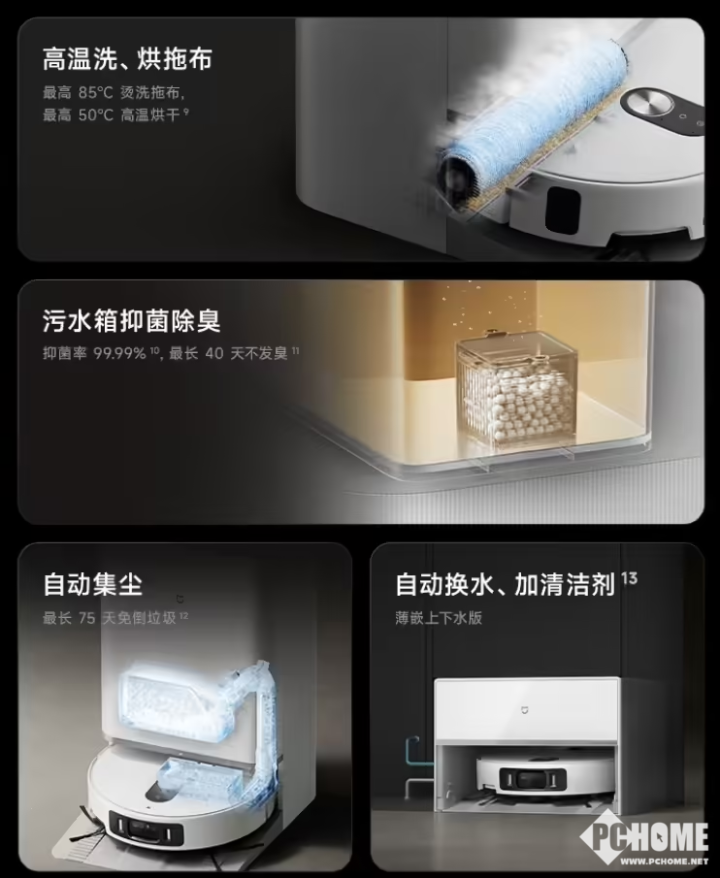 此外,产品完成清洁任务后,基站支持自动开启85°C高温烫洗拖布及50°C 高温热风烘干;污水箱版基座污水箱内置长效抑菌模块,抑菌率高达99.99%,有效减缓污水箱异味,最长达40 天不发臭;清扫完成回基座后,机身尘盒内垃圾自动吸入集尘袋内,不易扬尘、不易脏手;集尘袋超大容量,最长75天免倒垃圾。上下水版基座高度仅29厘米,能嵌入阳台柜体、水槽下方等区域,提高便捷性。