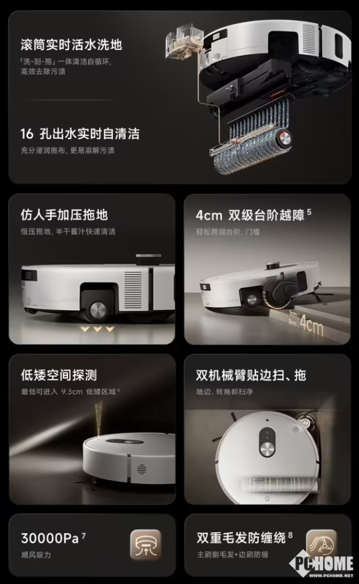 新品升级为滚筒式实时活水洗地系统,实现“刮、洗、拖”一体清洁,有效避免脏布二次污染。具备超强越障能力,可跨越4cm台阶,并支持最低9.3cm低矮空间清洁。搭载小爱同学语音控制,支持远程视频查看、遥控清洁及小米澎湃智联生态联动。并配备三摄视觉系统、自研AI脏污识别算法,拥有35000Pa超强吸力搭配双刀割毛发主刷,高效识别280种常见障碍物(如袜子、体重秤)及47种脏污类型(如酱汁、猫砂等),清理中自动调整清洁策略避免缠绕细线或碰撞。