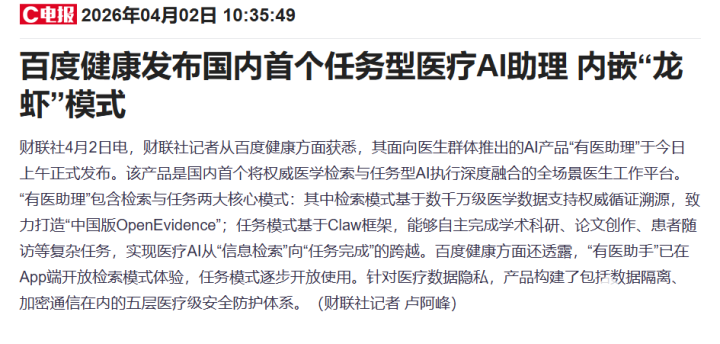 PChome 4月2日消息,据《财联社》报道,百度健康今日正式发布国内首款医生任务型AI助手——“有医助理”,业内俗称医生版“龙虾”,标志着医疗AI从“单一对话”迈入“任务执行”新阶段。