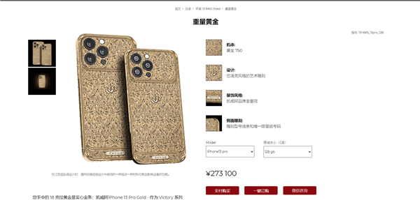 官方介绍,这款“重量黄金”版iPhone 13 Pro/Pro Max整个机体是由纯黄金制成,由18K实心黄金打造,并且机身覆盖了精致艺术雕刻以及唯美的巴洛克装饰,为机型增添了奢华的品味。