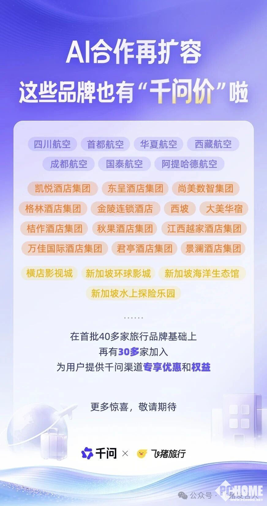 PChome 4月3日消息,飞猪在AI旅行预订领域的生态合作再度取得关键进展。继首批40多家品牌后,又有30多个国内外旅行品牌宣布加入其“千问价”计划。