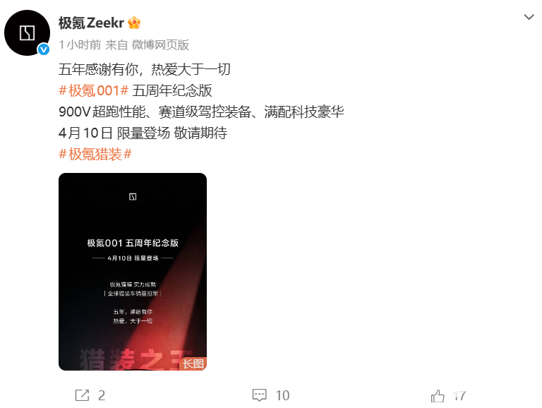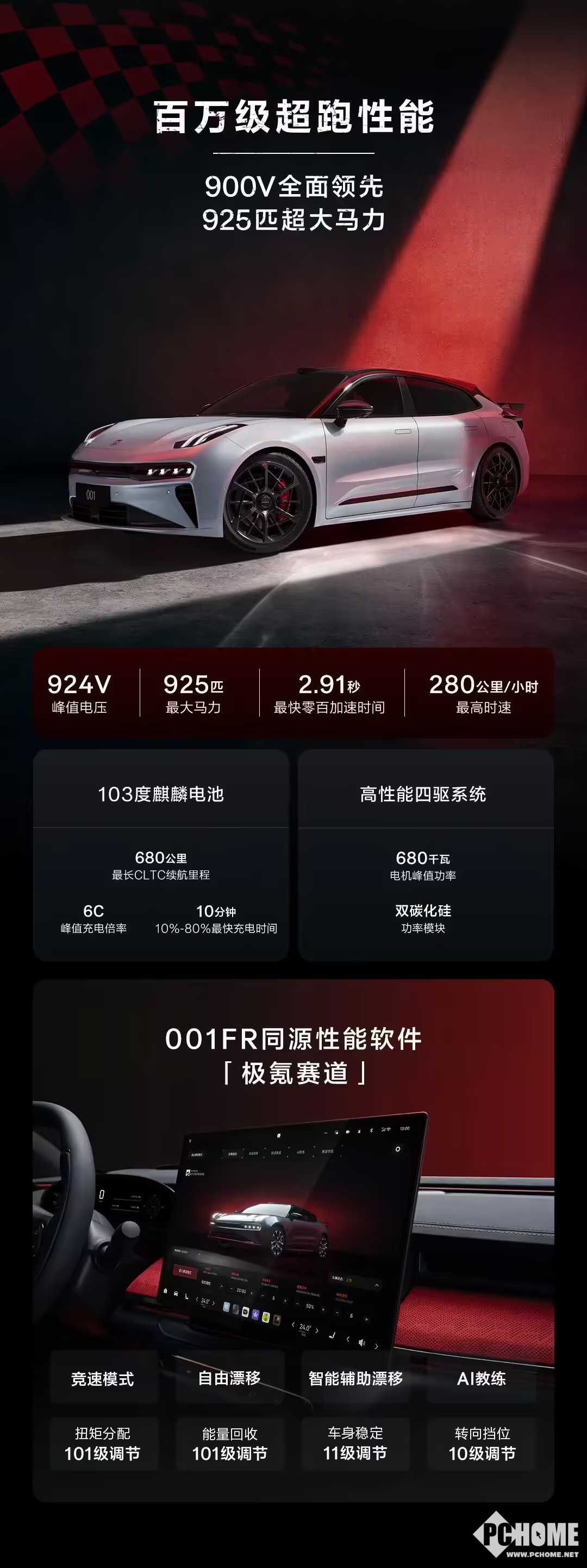 PChome 4月3日消息,极氪官方今日正式公布极氪001五周年纪念版详细配置信息,以925匹马力、全栈900V高压架构、赛道级驾控装备,将于4月10日限量上市。