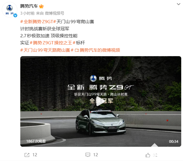 PChome 4月3日,今日,腾势汽车官方发布博文宣布腾势Z9GT在2026年4月1日举行的天门山99弯天路爬山赛计时挑战赛中,以原厂素车身份斩获全球冠军。